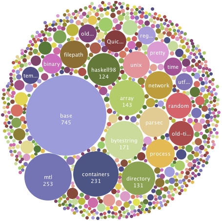 Don and I are doing our quick talk about hackage and the Haskell platform tomorrow. Chris and Eelco from Tupil have been helping us prepare some cool visualisations of Hackage. This one shows each package as a circle with the size indicating the number of other packages that use it. So the base package is the biggest of course with 754 other packages that use it.