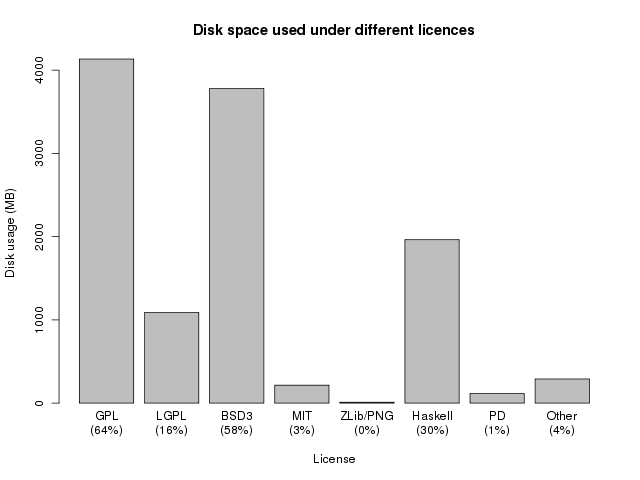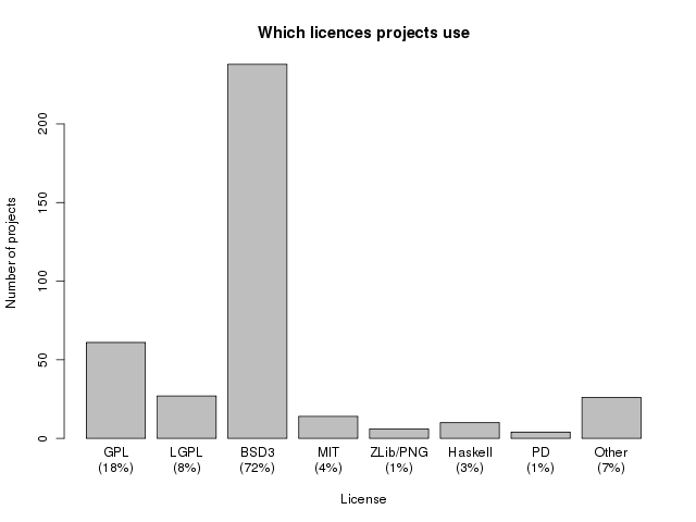 Unsurprisingly, BSD3 is the most common license, with GPL and LGPL next. The "Haskell" licence is the licence used for the Haskell98 report.