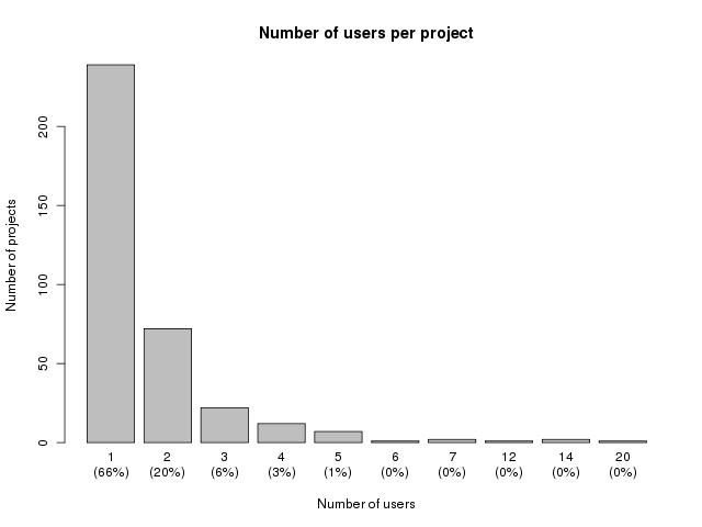 Looking at the number of users per project, most have a single developer, and the number tails of as one would expect: