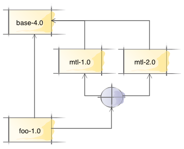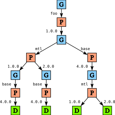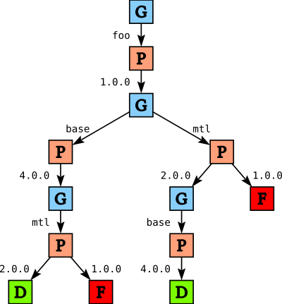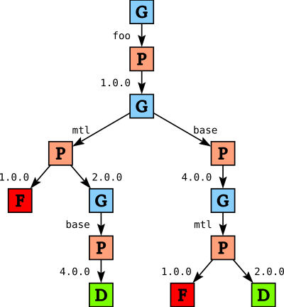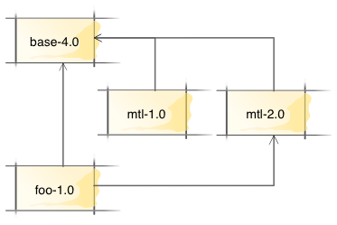 Suppose we have a package database with base version 4.0, mtl versions 1.0 and 2.0, both of which depend on base, and a package foo that depends on both base and mtl version 2.0.