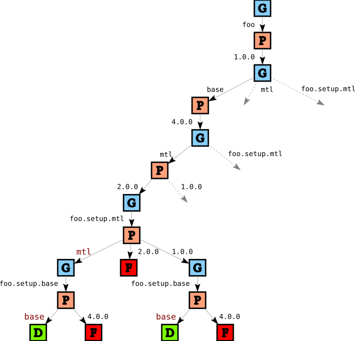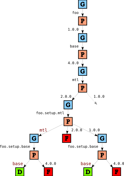 In this part of the tree we see one failure for foo.setup.mtl and two failures for foo.setup.base. The failure for foo.setup.mtl comes from the single instance restriction again: since we picked version 2.0 for mtl, we cannot pick an independent instance for foo.setup.mtl. The failure for foo.setup.base on the right is due to the same reason, but there is an additional reason for the left failure: since we chose to link foo.setup.mtl to mtl, its dependencies (in this case, foo.setup.base) must also be linked.
