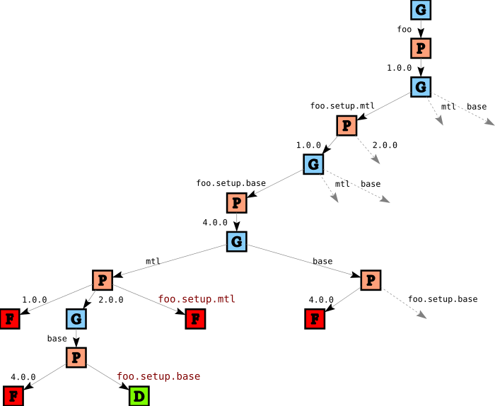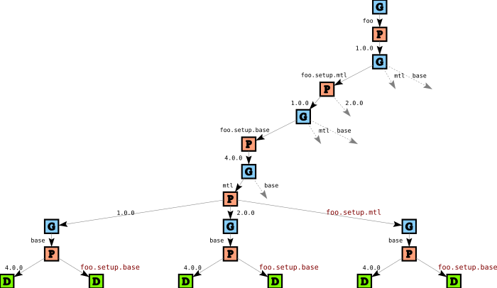 In the remainder of the tree we then pick a version for mtl (here we do have a choice in version), and then a version for base, or the other way around. Note that when we build the tree, package constraints are not yet applied: in the tree so far there is nothing that reflects the fact that foo wants version 2.0 of mtl, and every path ends with a Done node D, indicating success. Indeed, we would get precisely the same tree if we have a package DB