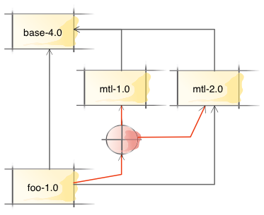 In this part of the tree, the two failures for mtl are because we picked version 1.0 for foo.setup.mtl, but since foo itself wants mtl version 2.0, we cannot pick version 1.0 for goal mtl nor can we link mtl to foo.setup.mtl. The two failures for base are due to the single instance restriction: since we picked version 4.0 for foo.setup.base, we must link base to foo.setup.base.