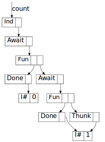 main = retry $ feedFrom 10000000 (countChars 0)We explained how countChars 0 results in a chain of Await constructors