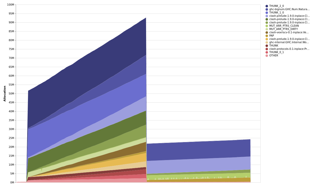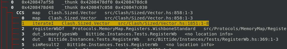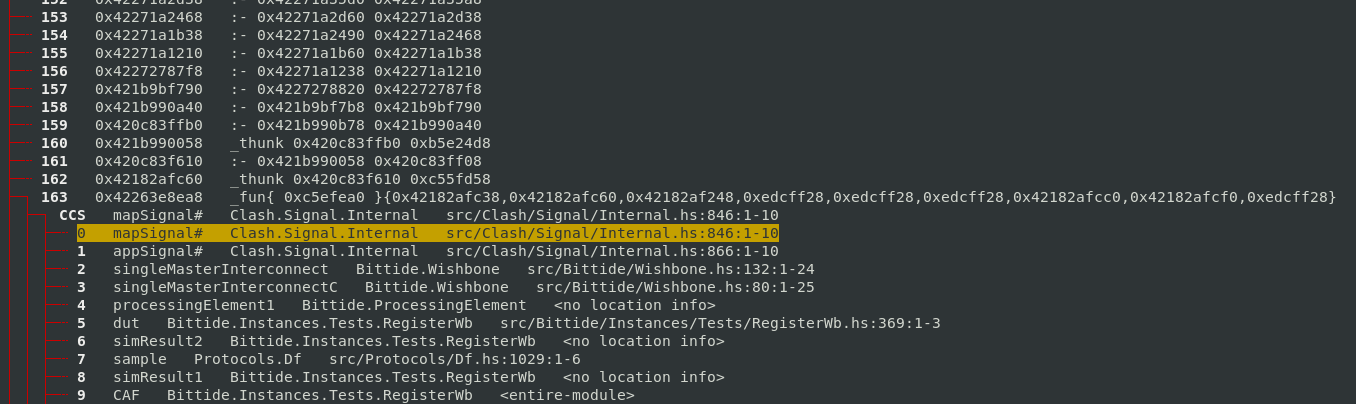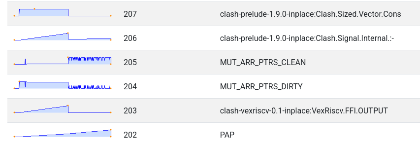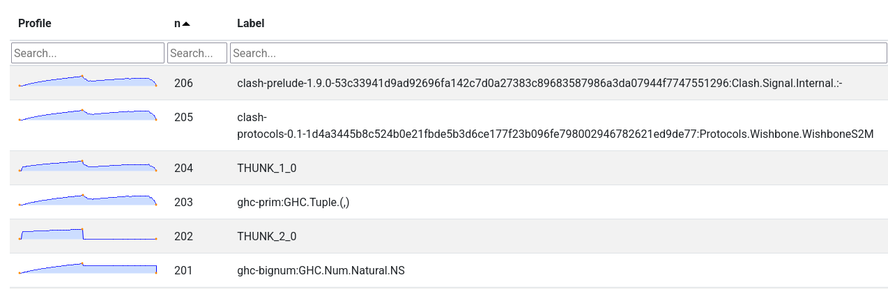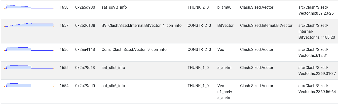 After consulting the source code in the relevant places, I quickly realised that this wouldn’t necessarily be as straightforward an investigation as I had hoped. I had hoped that the THUNK_1_0 locations reported in the -hT profile would be clear that my hypothesis about retaining was correct, but the -hi profile didn’t show up anything directly wrong. These locations were normal ways you could construct a Clash circuit.
