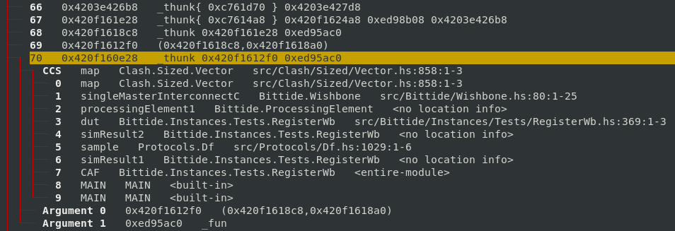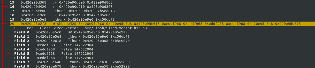 Looking at the source code for the sat_ssVQ thunks, they come from the Clash.Sized.Vector.map function. Therefore… back to ghc-debug to see what retains these map thunks, and the callstack where they are allocated from. This time I used “Find Retainers (Exact)”, to find closures which are named sat_ssVQ_info.