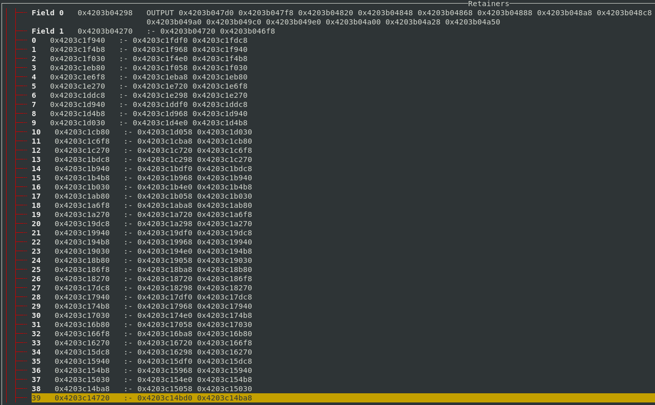 The question then becomes, why is :- being retained? I scrolled, for a long while, and eventually get to the point where the chain of :- constructors is retained by a non-:- constructor. That’s the interesting part since it’s the part of the program which led to the long chain being retained.