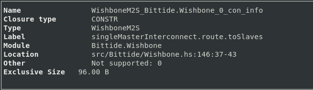 Therefore I instrumented the test executable, and launched ghc-debug-brick in order to query what was retaining :- and WishboneS2M. This was the start of making progress on the investigation.